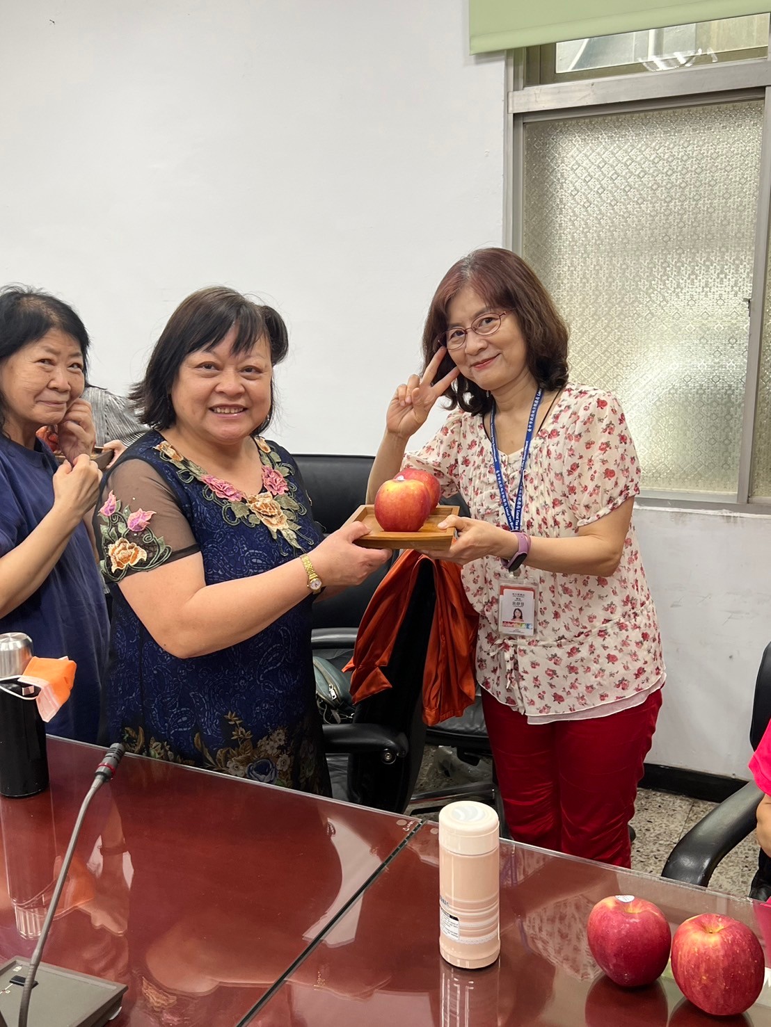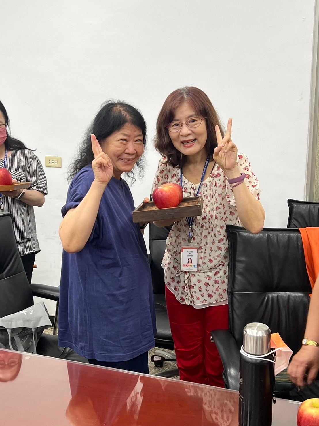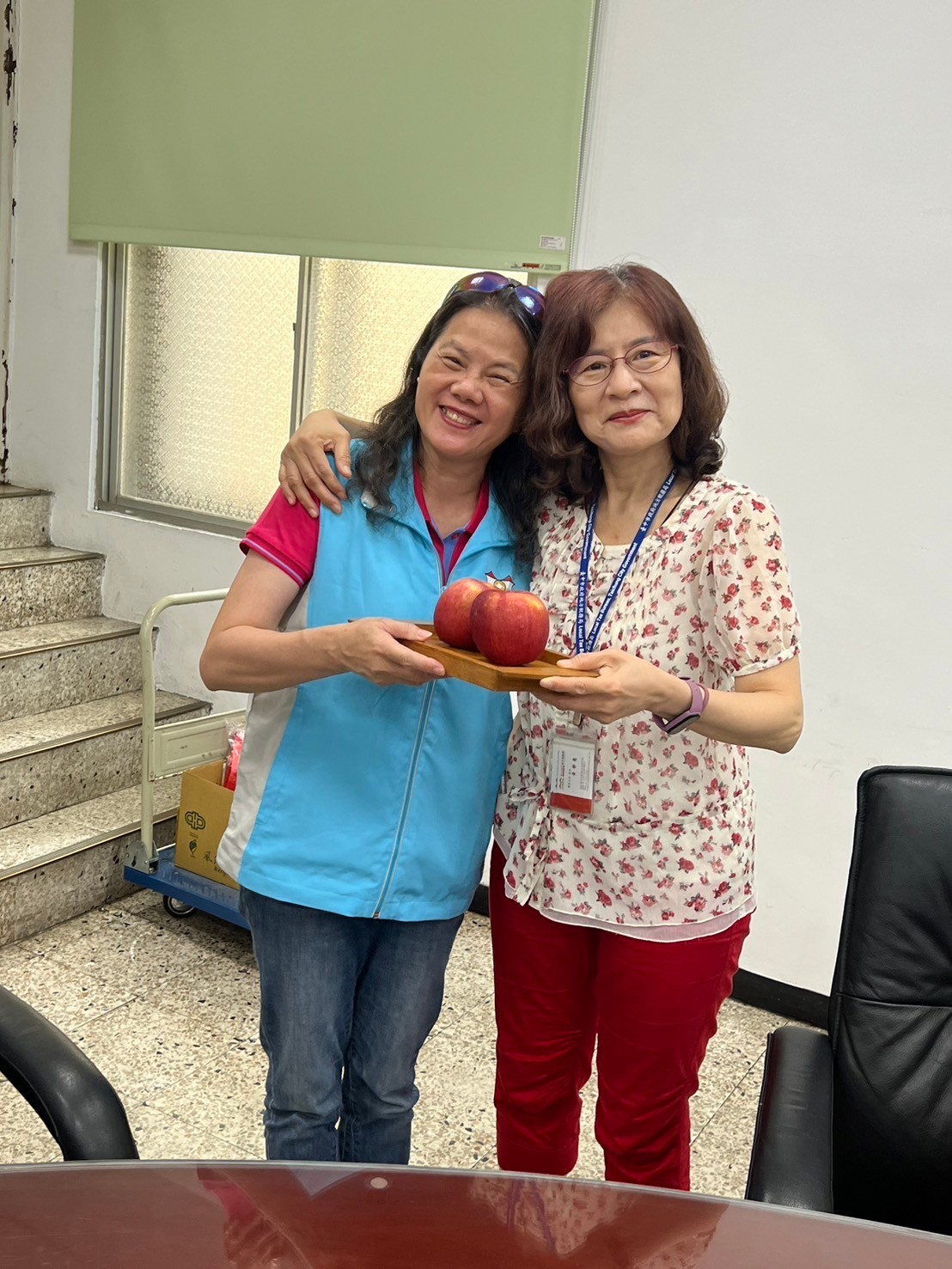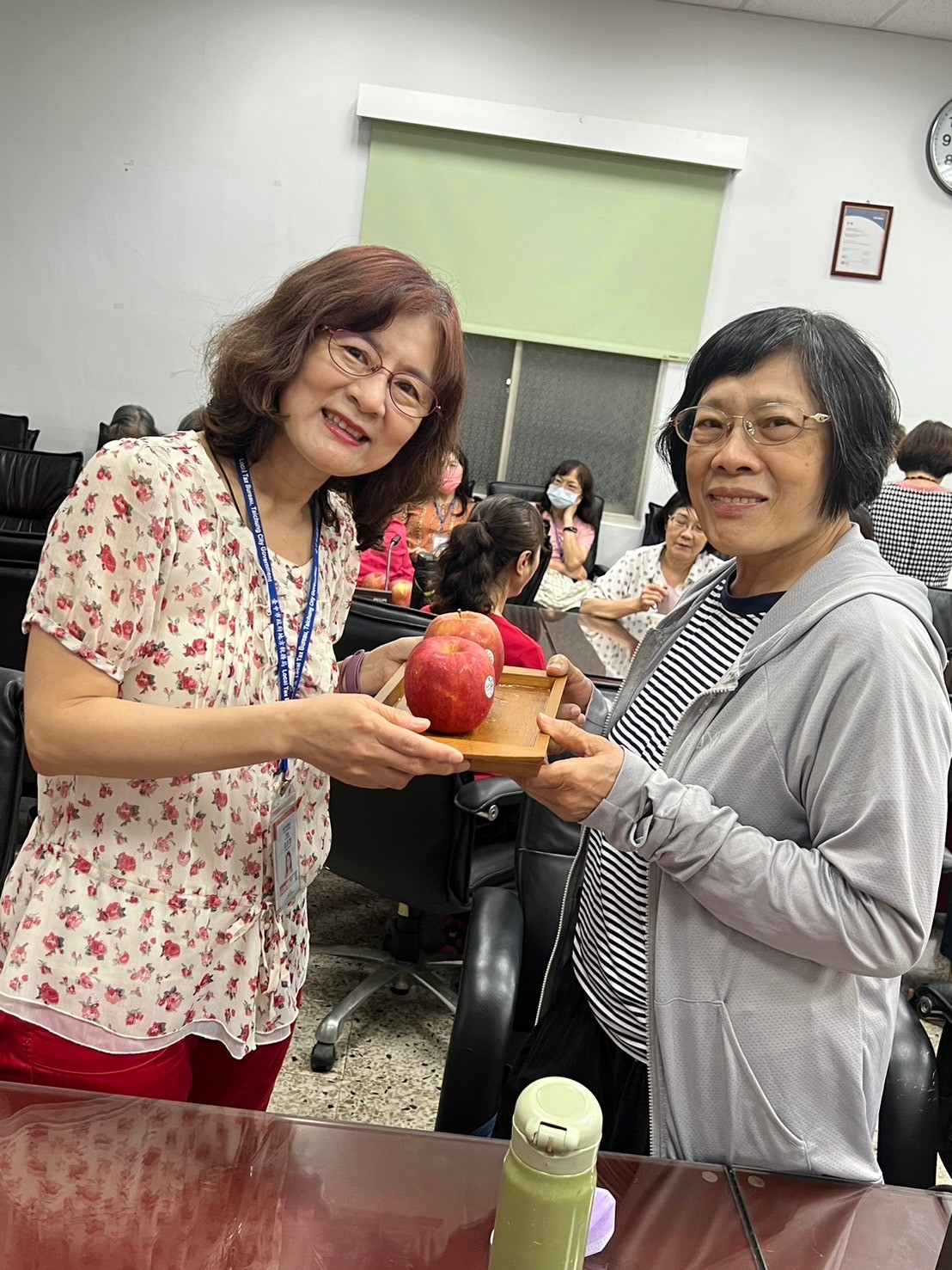 由主任及稽核致贈每人2顆蘋果,祝福志工夥伴們平平安安、身體健康,將志願服務的精神延續、發光發熱。