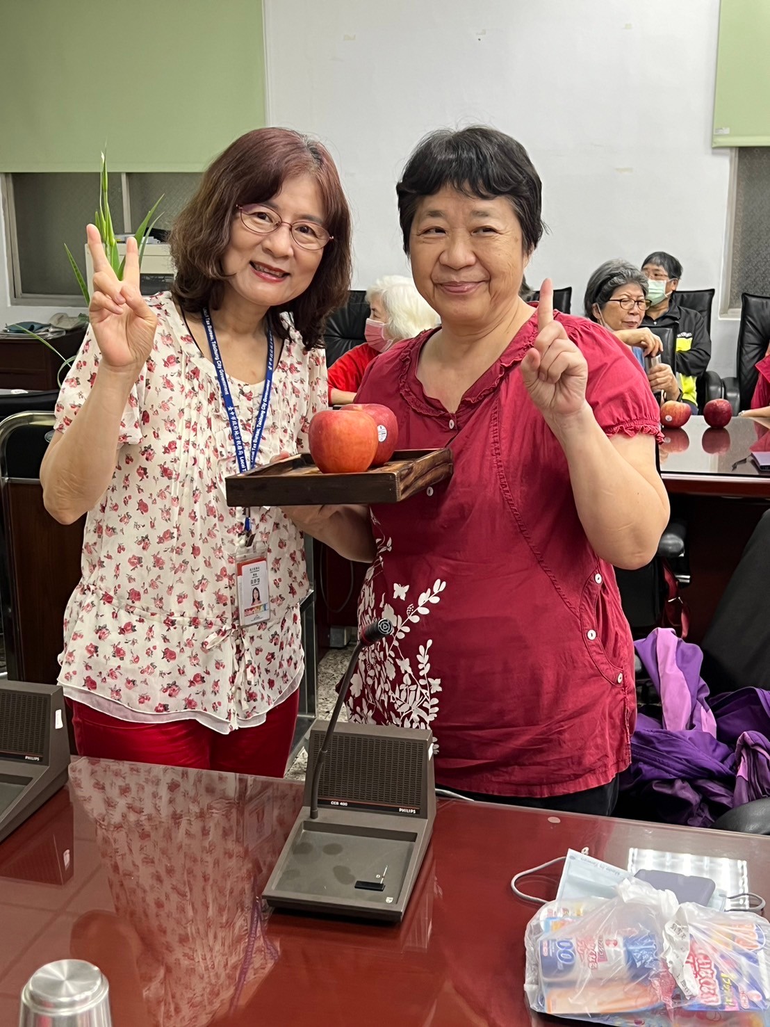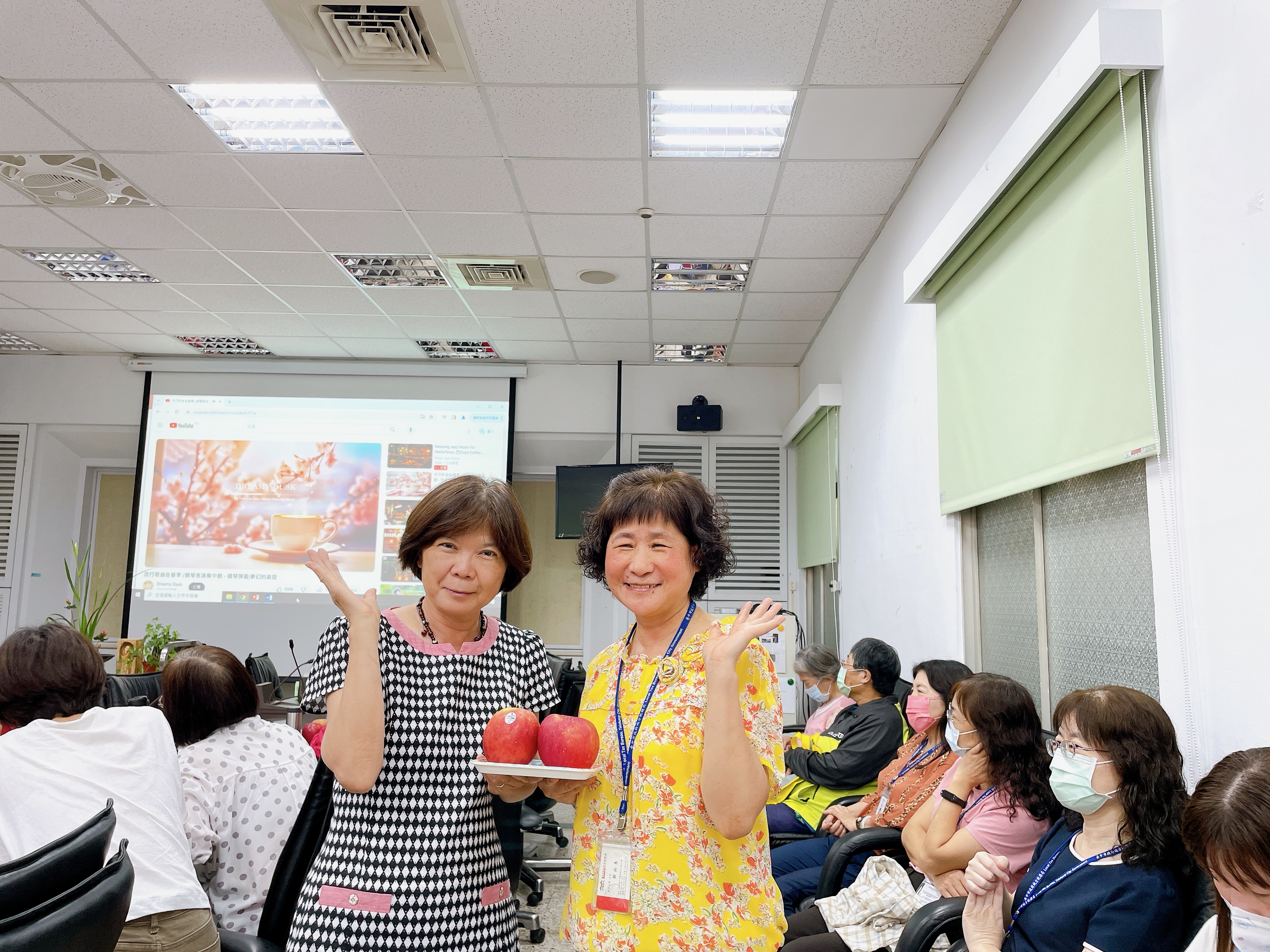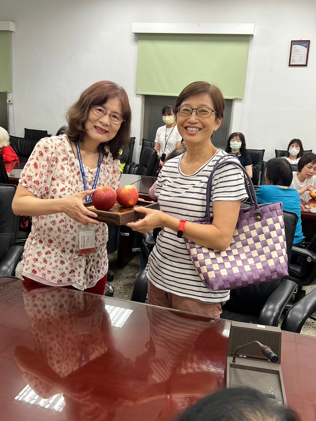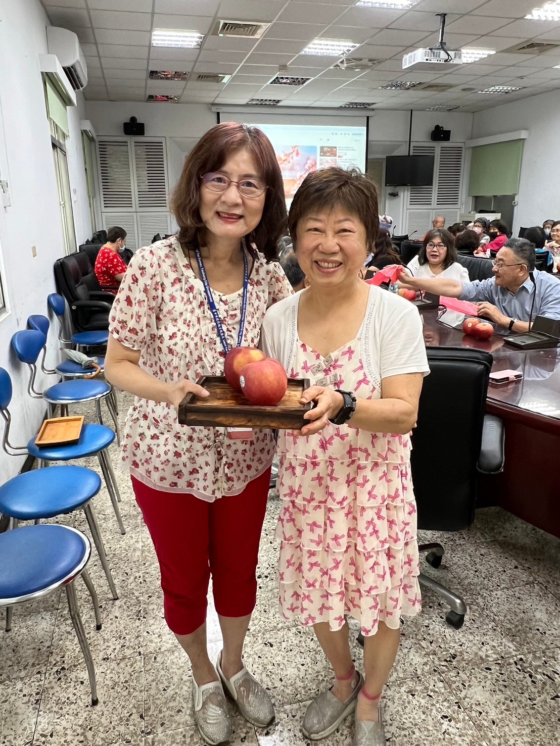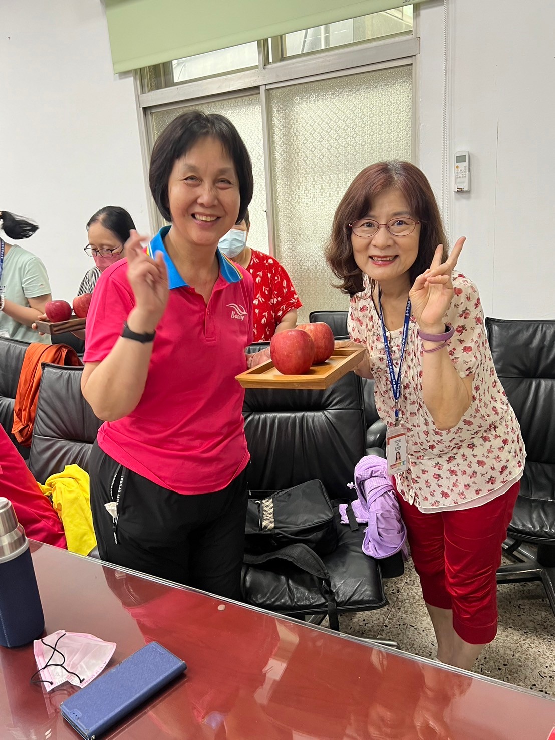 由主任及稽核致贈每人2顆蘋果,祝福志工夥伴們平平安安、身體健康,將志願服務的精神延續、發光發熱。
