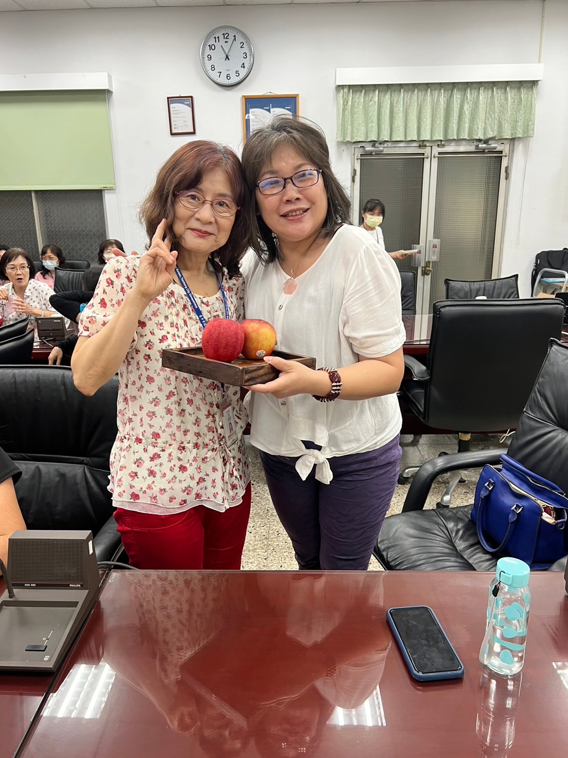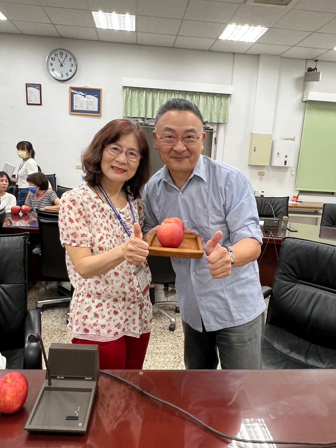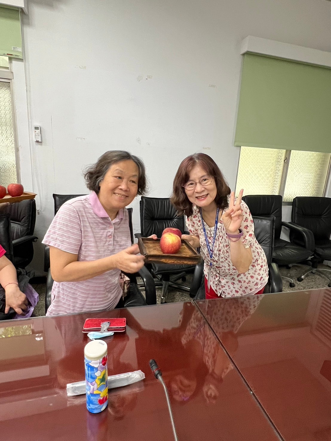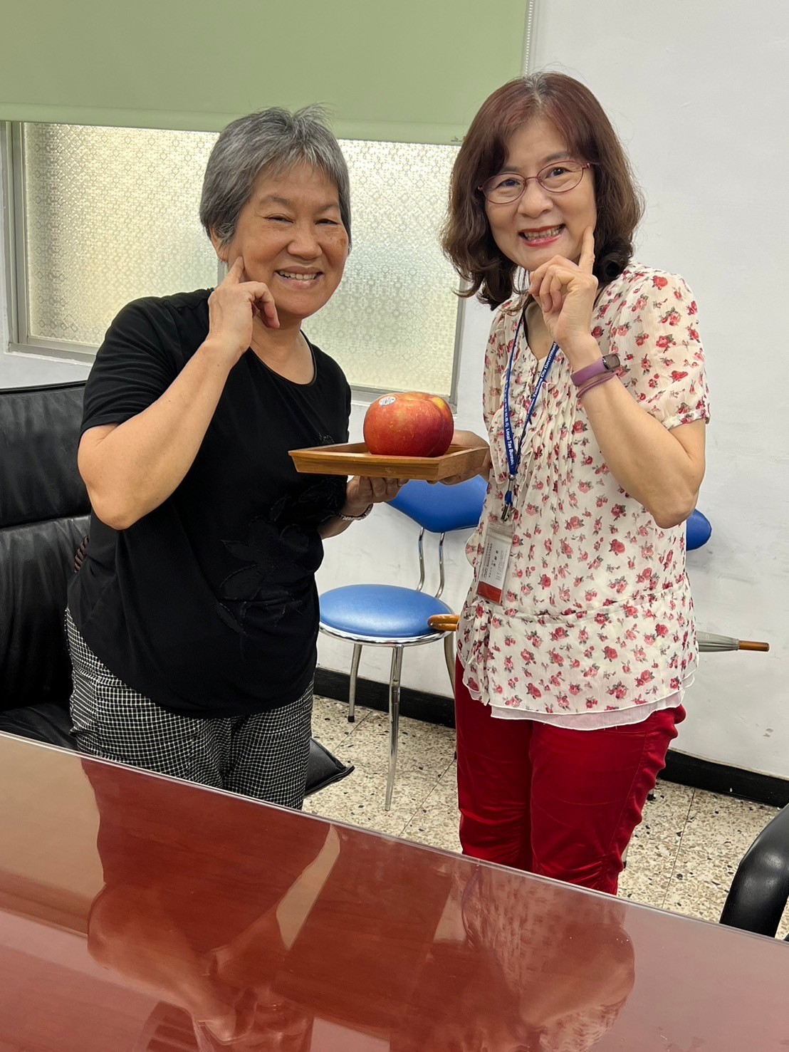 由主任及稽核致贈每人2顆蘋果,祝福志工夥伴們平平安安、身體健康,將志願服務的精神延續、發光發熱。