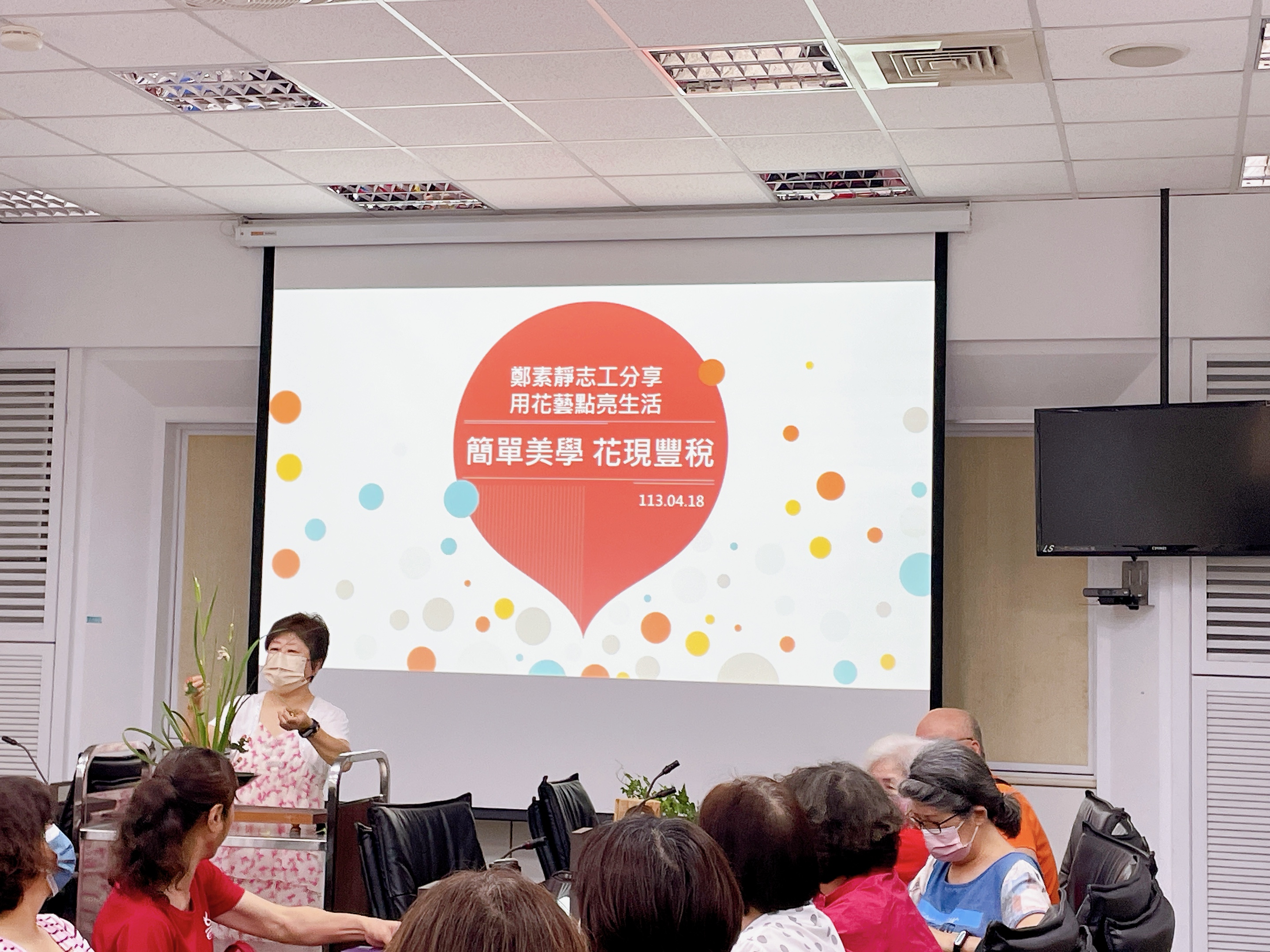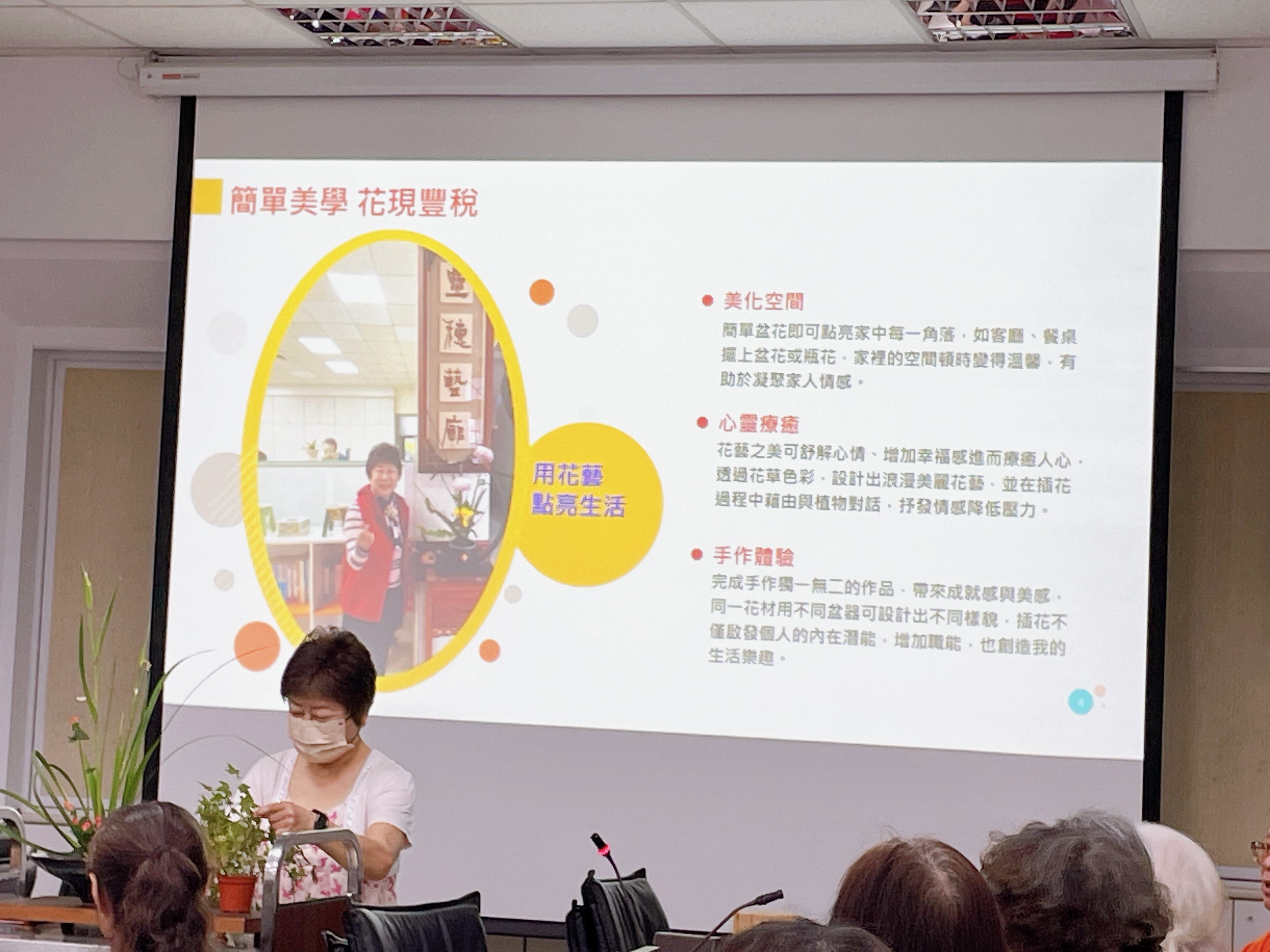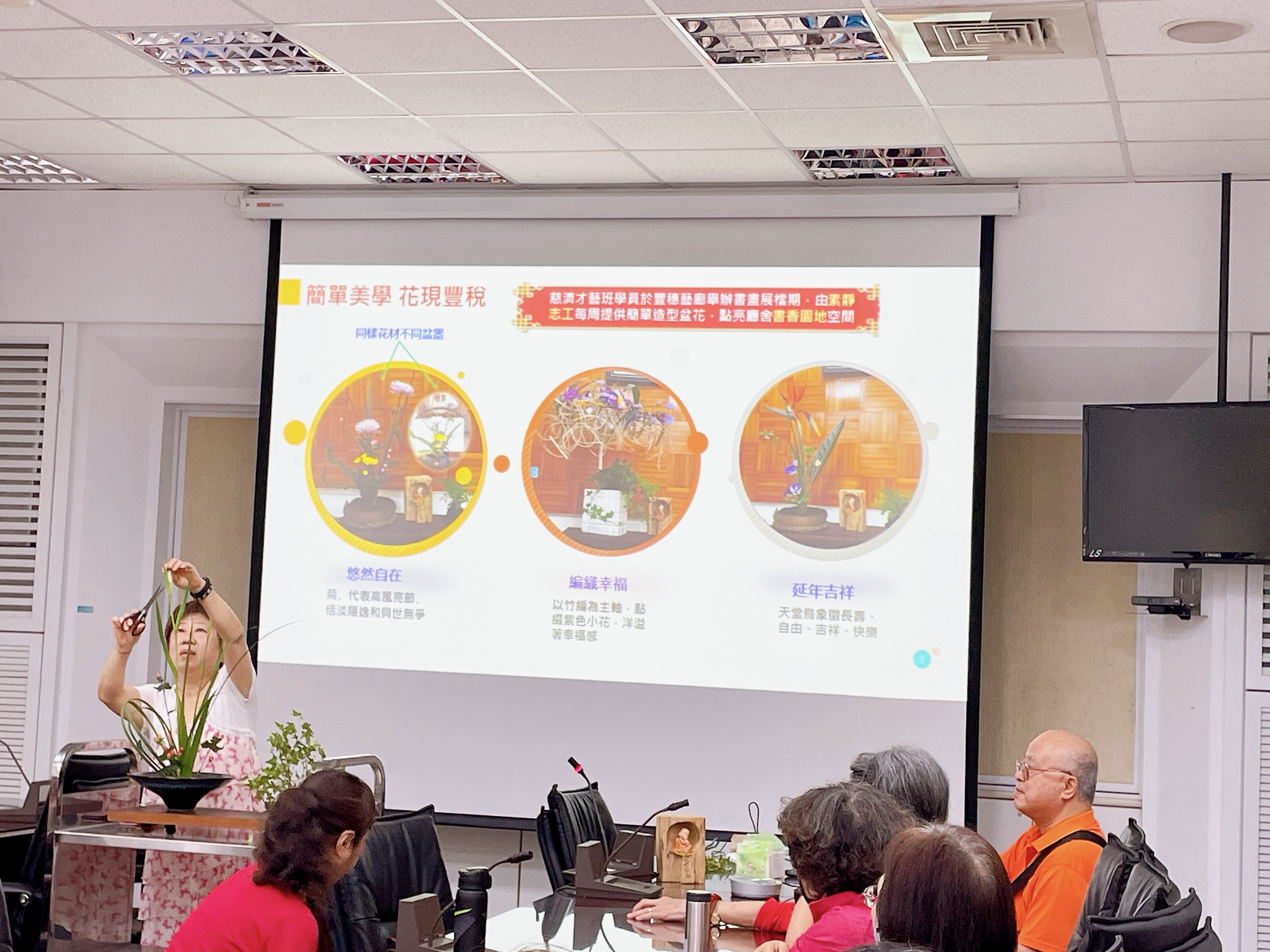透過志工分享創作花藝的心得與啟發,花藝之美可以改變居家氛圍,紓解身心壓力,在「拈花惹草」過程中帶來心情沉澱,有助於心靈療癒,增加自我意識及同理心,進而提升服務品質。