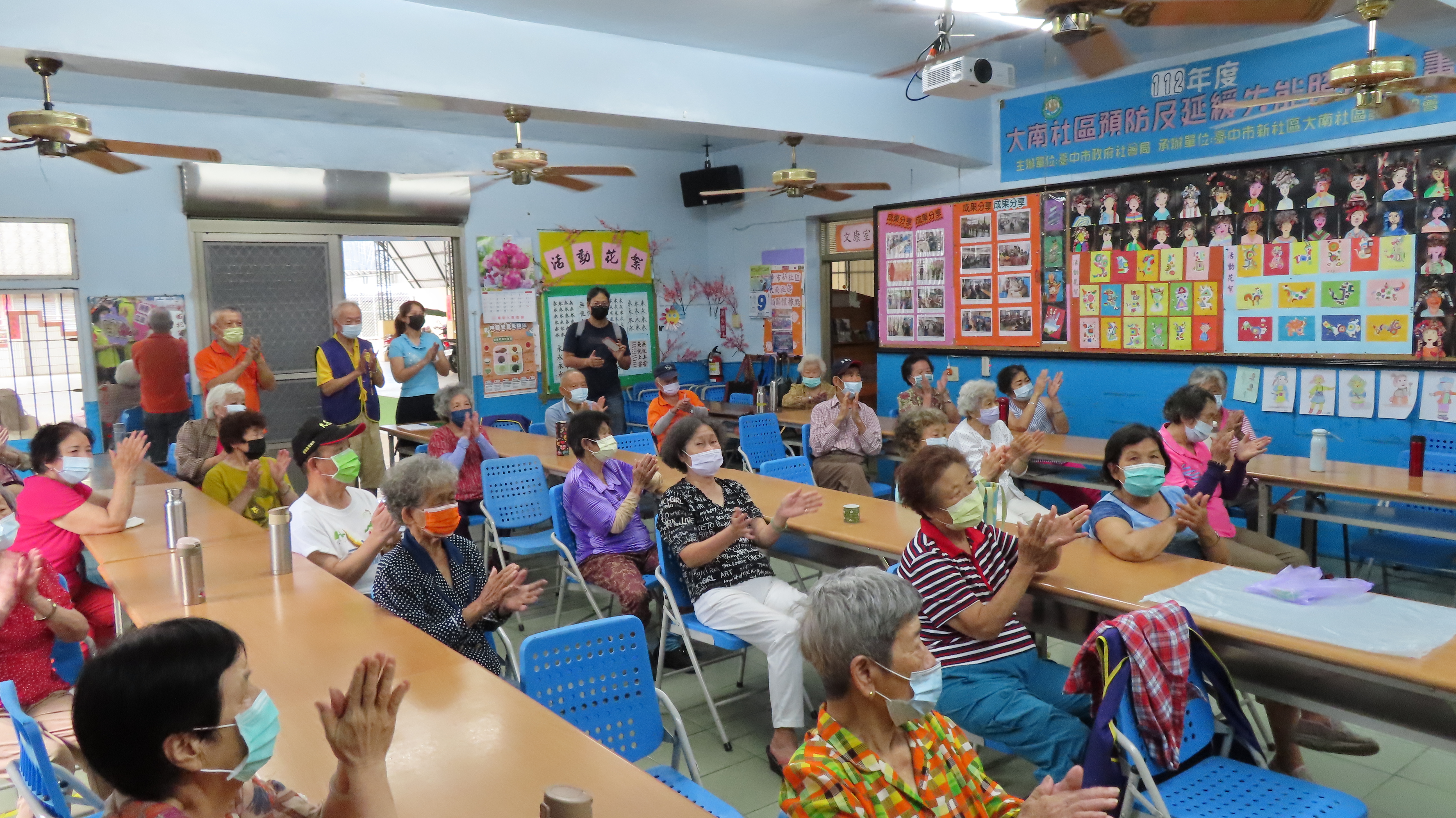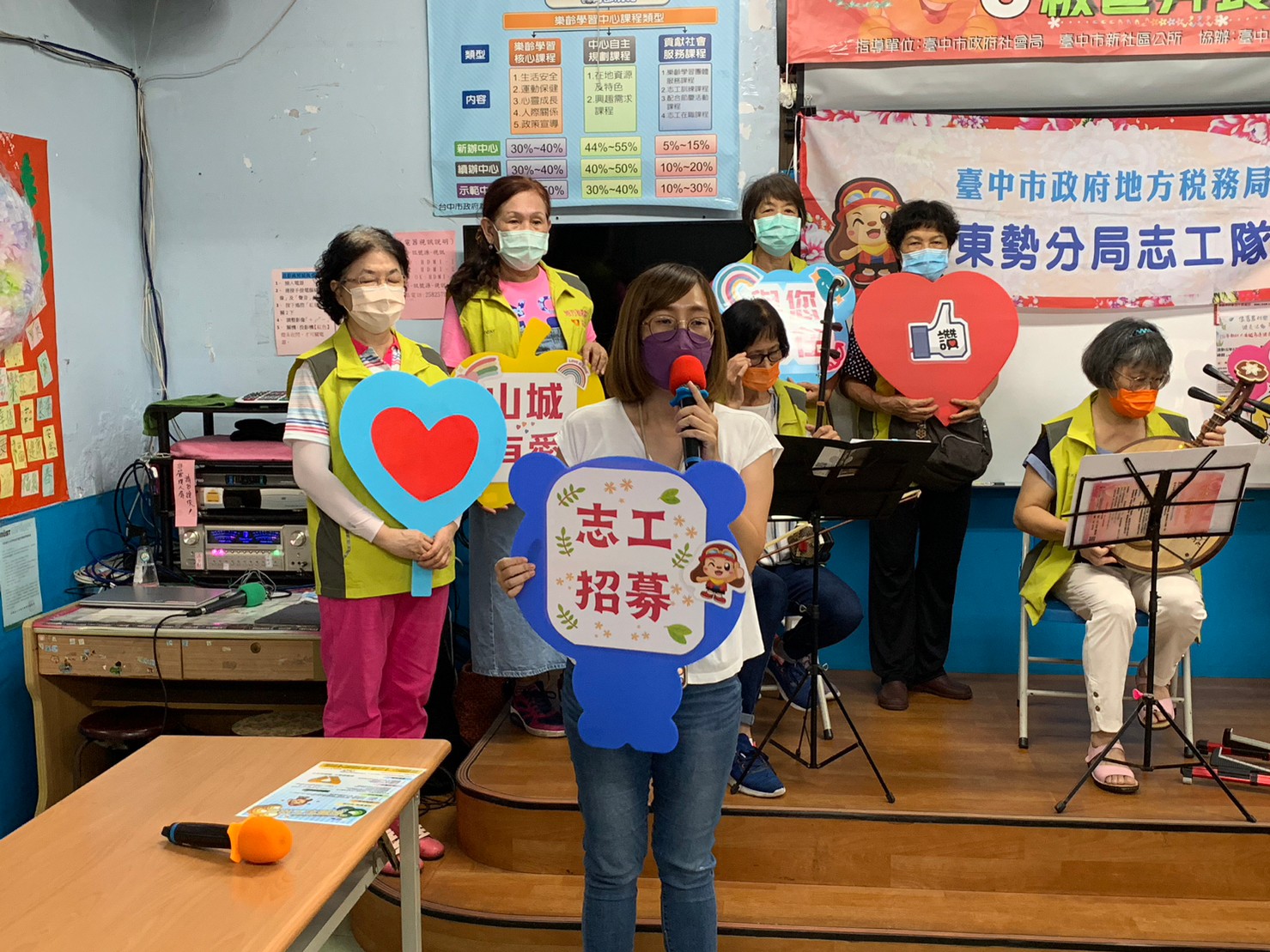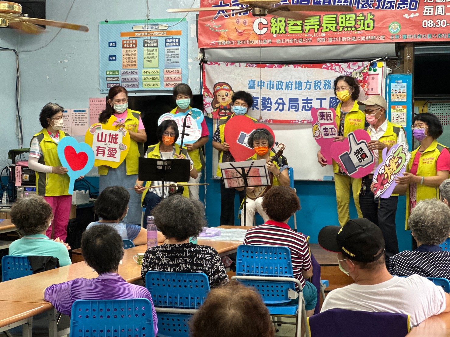 東勢志工隊在大南社區夥伴以月琴及二胡合奏「快樂的出帆↓、「茉莉花」2首曲目,引道大家一同合唱,以音樂療癒長者!