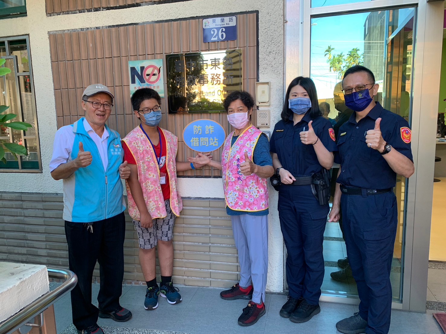 02志工隊長周炳財與地政事務所志工.東勢派出所員警一同宣導地政政防詐借問站