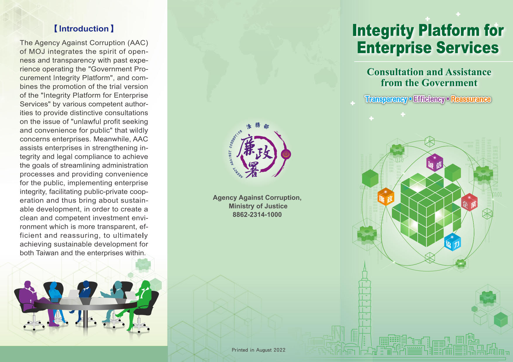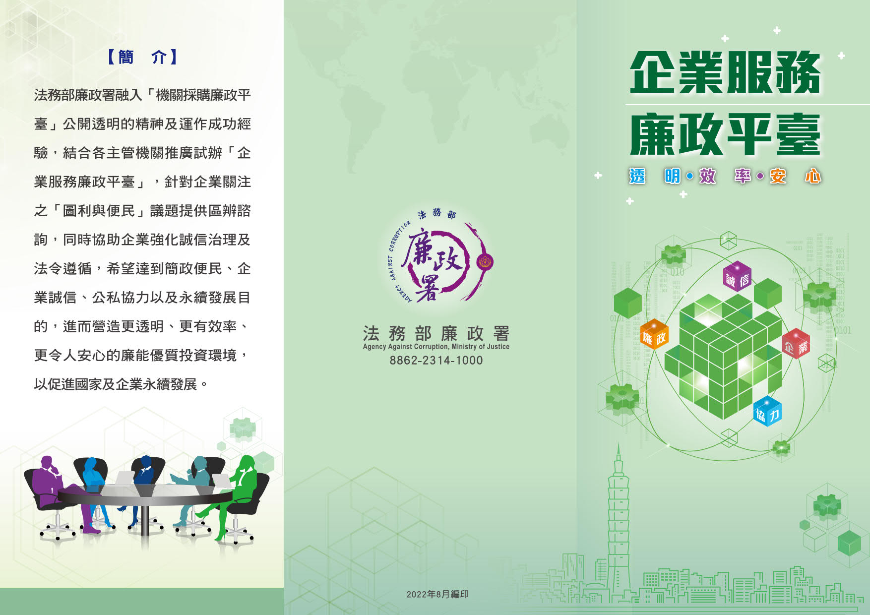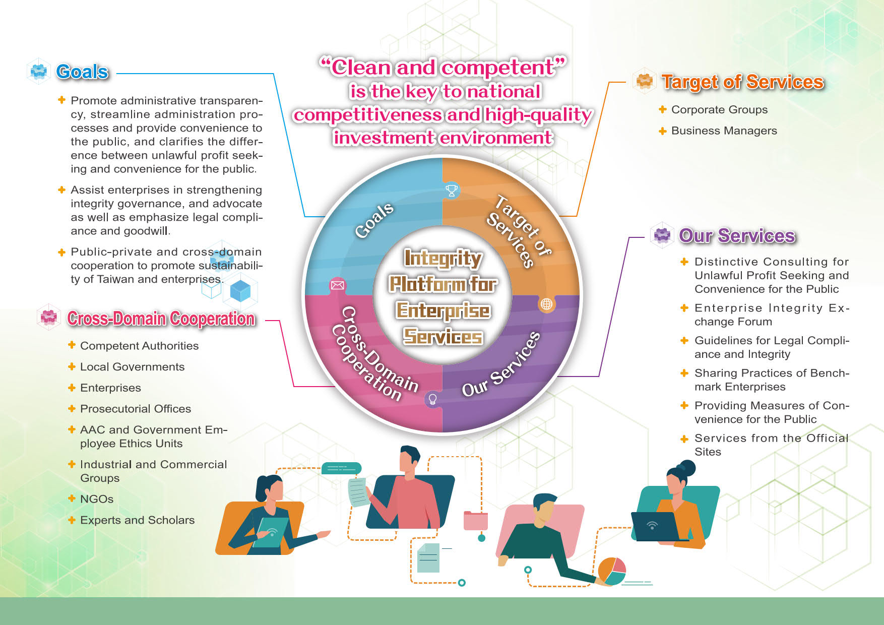 廉能是國家競爭力與優質投資環境的關鍵,以「簡政便民」、「企業誠信」、「公私協力」、「永續發展」等四大核心內涵,持續推動「企業服務廉政平臺」,與企業成為實質夥伴關係,共創國家與企業的永續發展。