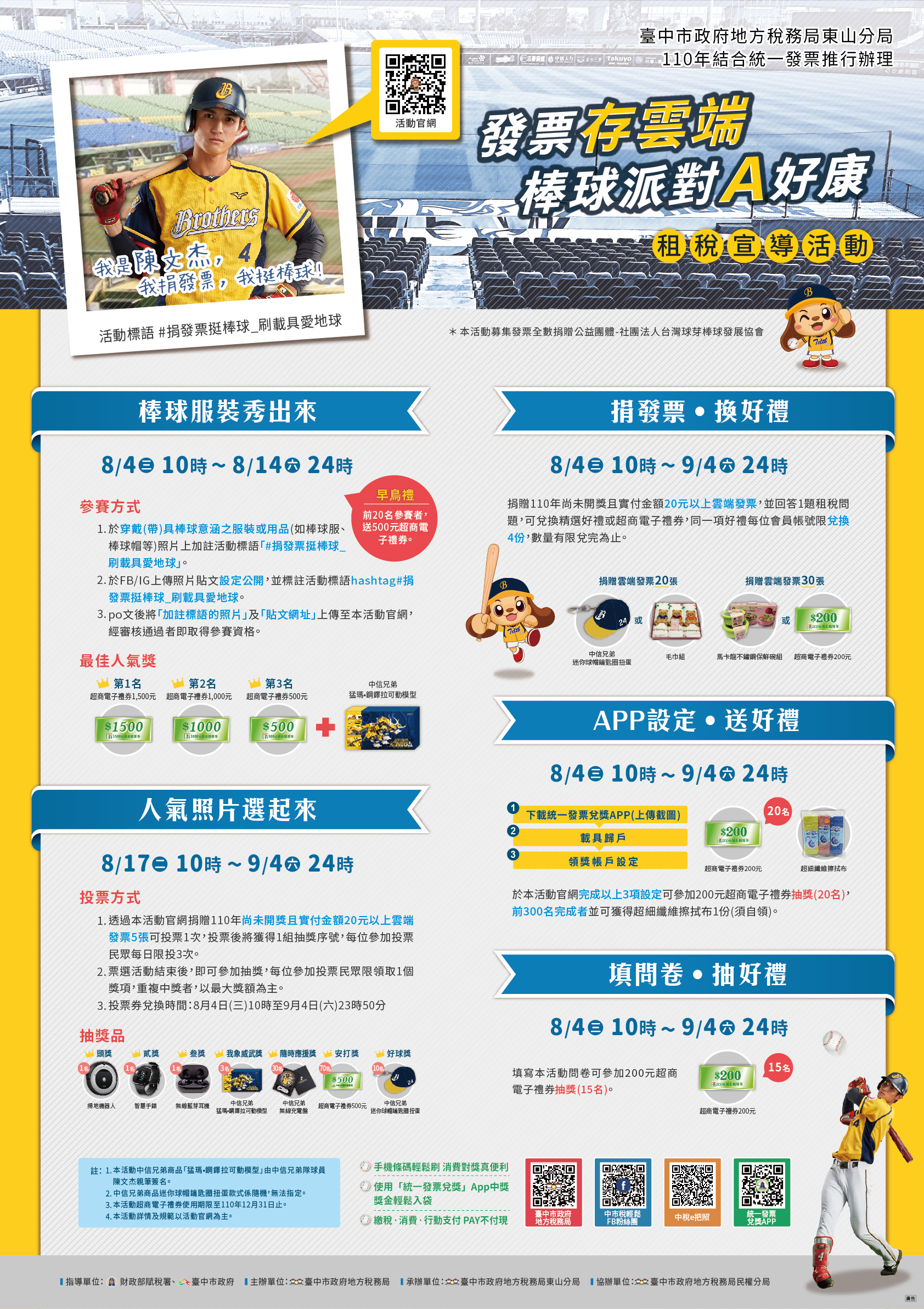 (臺中訊)臺中市政府地方稅務局表示,為鼓勵民眾使用雲端發票及行銷臺中市棒球在地文化,將於8月4日至9月4日辦理「發票存雲端 棒球派對A好康」線上租稅宣導活動,由中華職棒─中信兄弟選手「陳文杰」代言。邀請您上傳照片參加棒球服裝秀比賽及票選活動,還有捐發票換好禮等精彩活動,豐富大獎等著您。