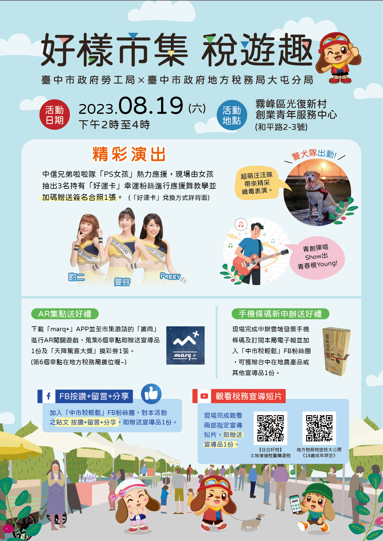 (臺中訊)臺中市政府地方稅務局大屯分局結合勞工局於112年8月19日下午2時至4時,在光復新村(霧峰區和平路2-3號)舉辦「好樣市集 稅遊趣」租稅宣導活動,邀您一起熱情參與。
