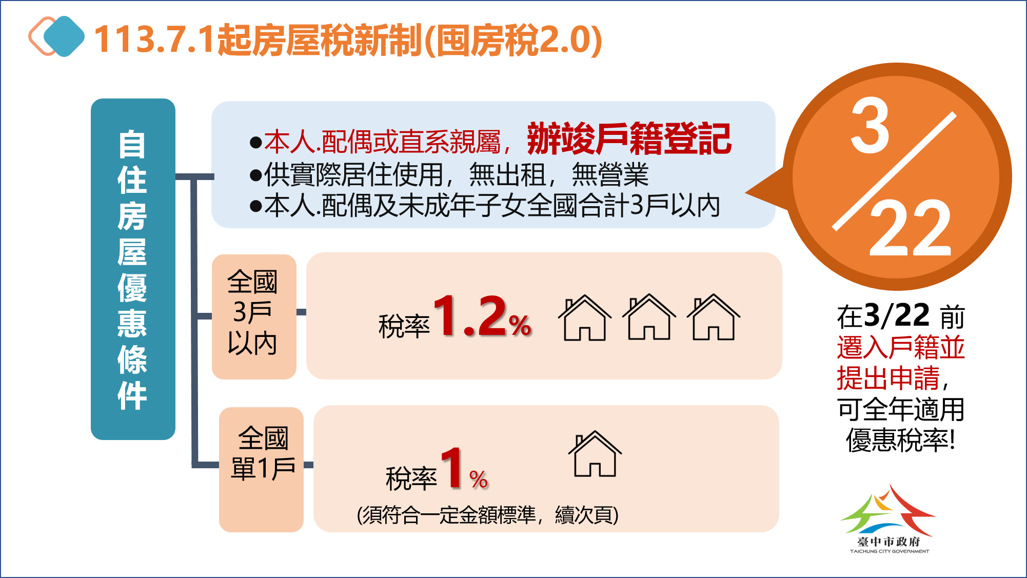 該局表示,房屋稅要適用自住住家用房屋優惠稅率1.2%,除須符合無出租、無營業,並供本人、配偶或直系親屬實際居住使用,且本人、配偶及未成年子女合計持有全國不超過3戶之外,7月1日起還必須有本人、配偶或直系親屬任一人於該屋設立戶籍。而如本人、配偶及未成年子女僅持有全國單一戶且房屋現值在一定金額以下者,適用房屋稅率將由原本1.2%降為1%。