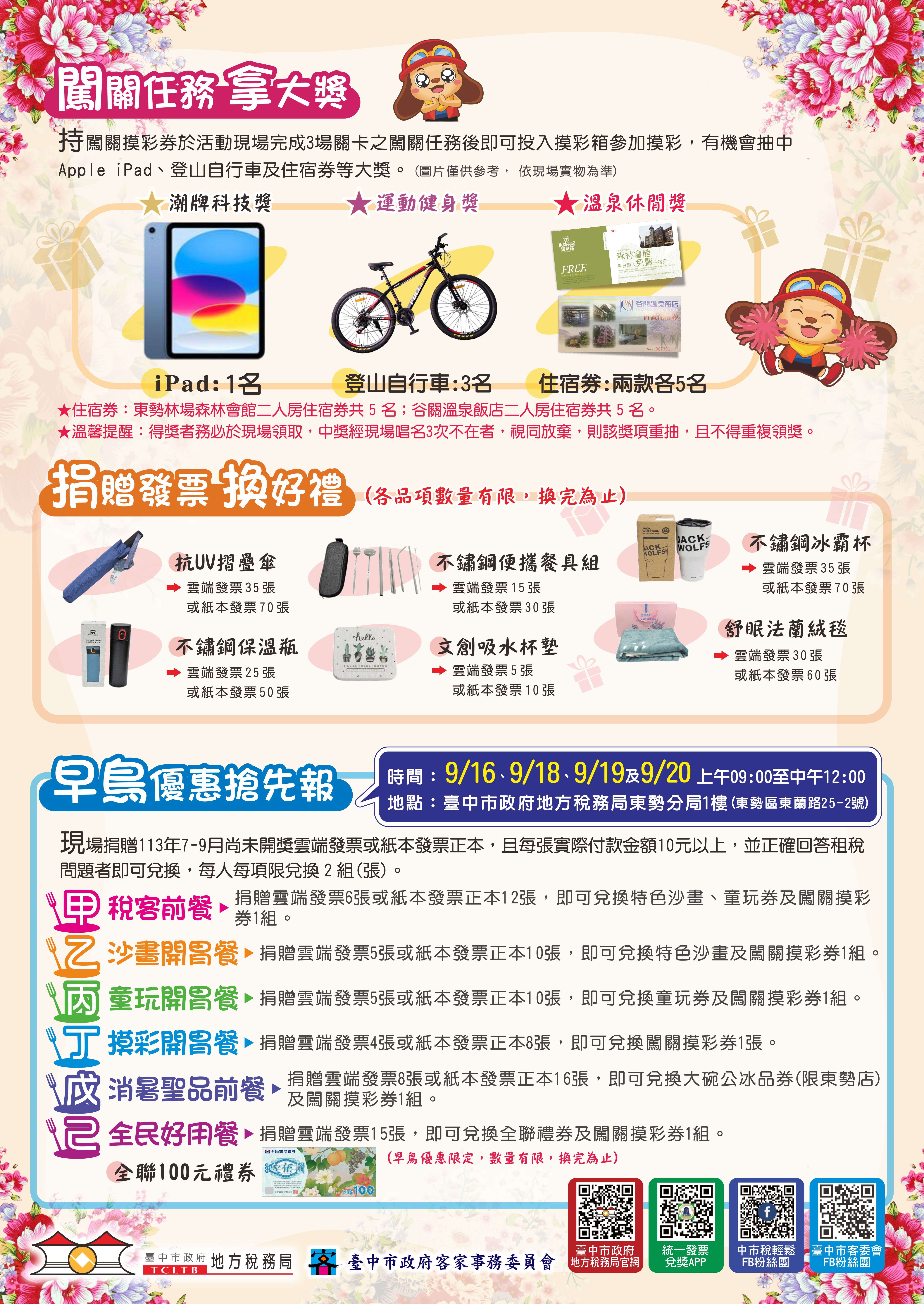 地稅局表示,此次活動設有早鳥優惠搶先報活動,日期為9月16日、9月18日至20日共4天的上午9時至12時在稅務局東勢分局(東勢區東蘭路25之2號)辦理,民眾可以捐贈尚未開獎消費金額10元以上之指定張數雲端發票或紙本發票正本,即可兌換特色沙畫、童玩券、闖關摸彩券、冰品券及精美宣導品等好禮,捐贈發票張數較活動當日優惠,還有搶先報活動專屬的全聯禮券,數量有限,兌完為止,請民眾把握時機兌換。