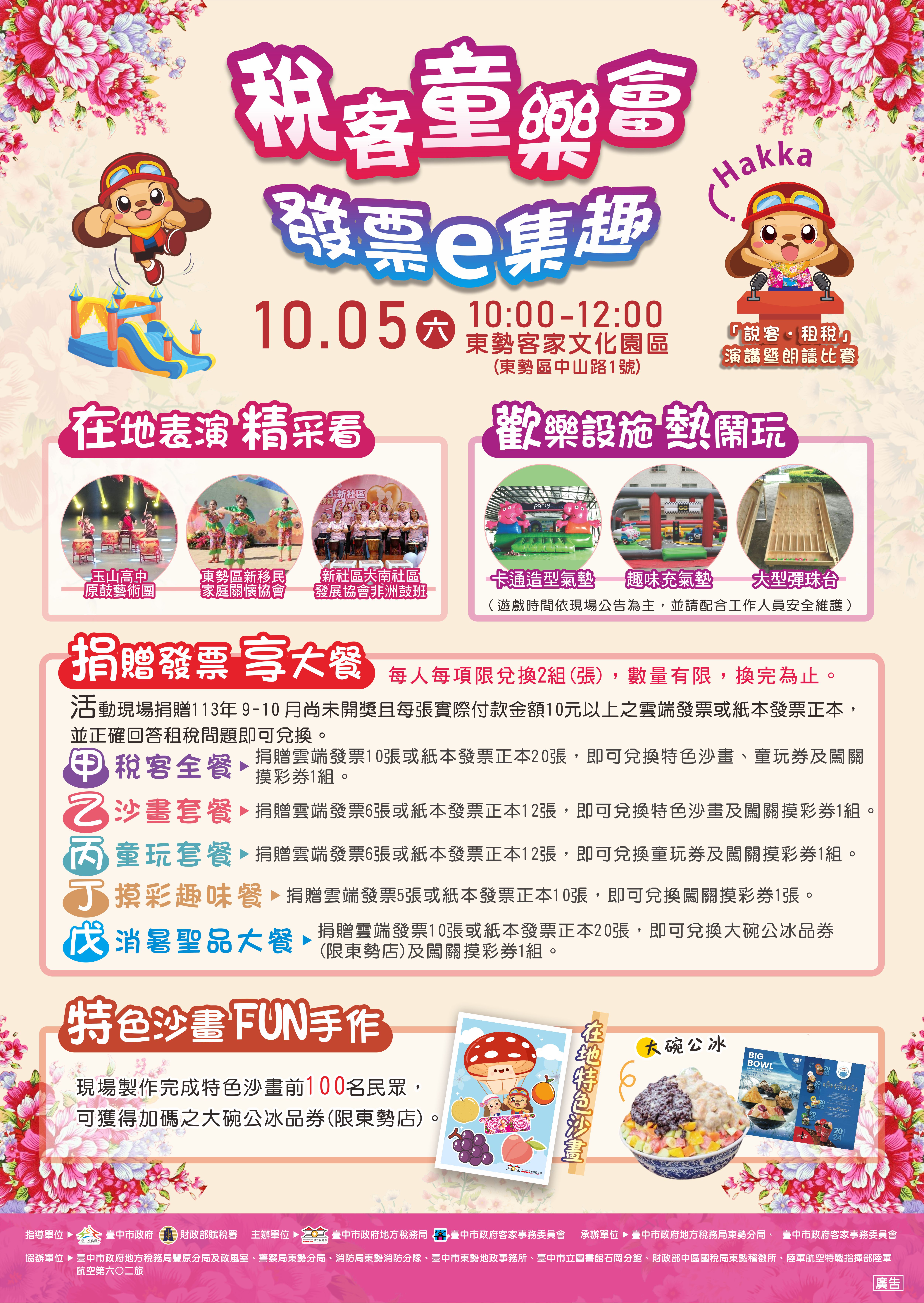 (台中訊)台中市政府地方稅務局東勢分局聯合客家事務委員會將於10月5日(星期六),在東勢客家文化園區廣場及沙龍空間舉辦「稅客童樂會.發票e集趣」租稅宣導(時間10時至12時) 及「說客‧租稅」演講暨朗讀比賽活動(時間9時至12時),誠摯邀請市民朋友一同捐發票做公益、看表演、作沙畫、玩遊戲並體驗客語之美。