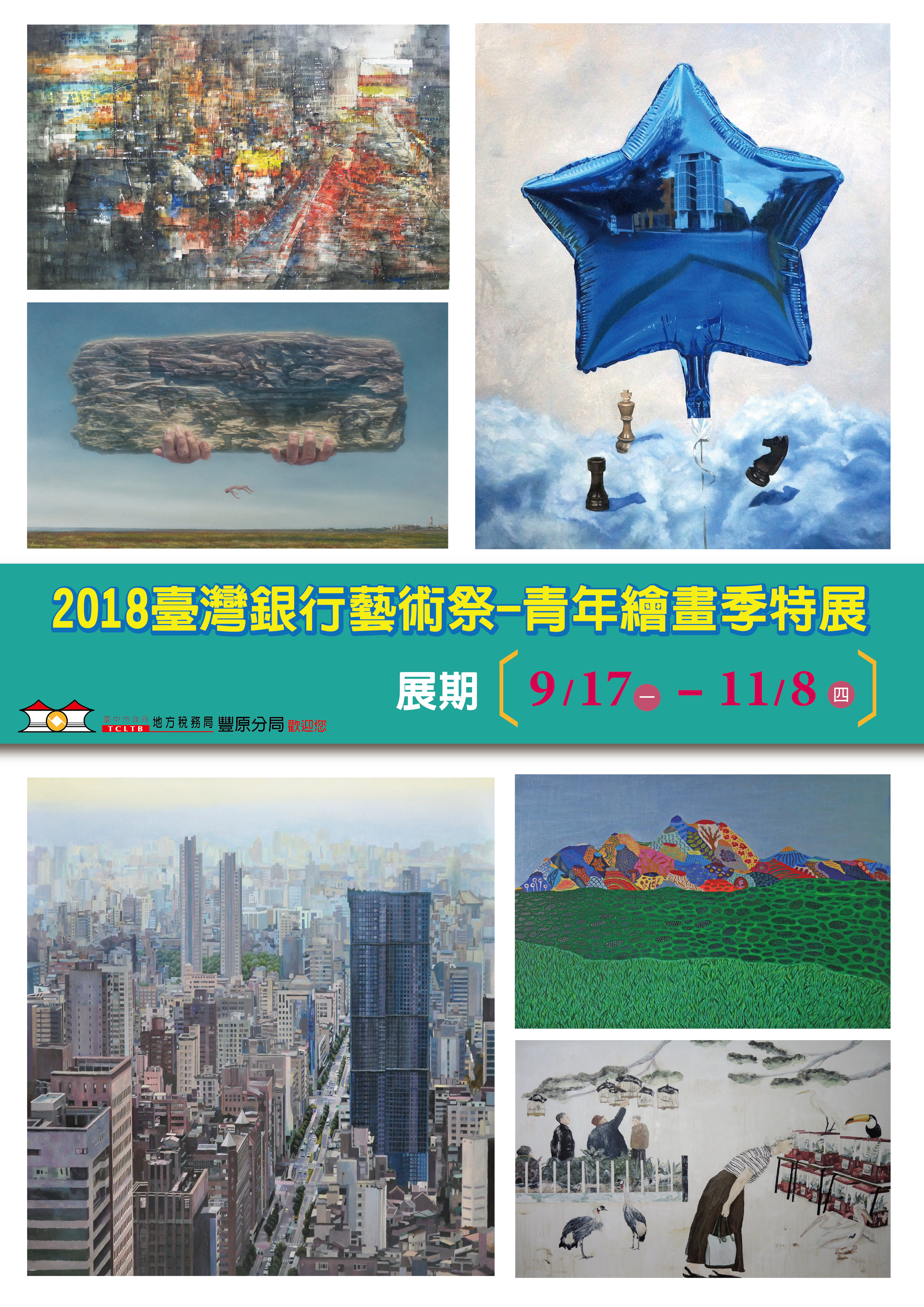 臺中市政府地方稅務局豐原分局自9月17日起至11月8日止,展出由2018臺灣銀行藝術祭中脫穎而出的得獎者精彩畫作,開放參觀時間為每日上午8時至下午5時,不含例假日,歡迎踴躍前往欣賞。